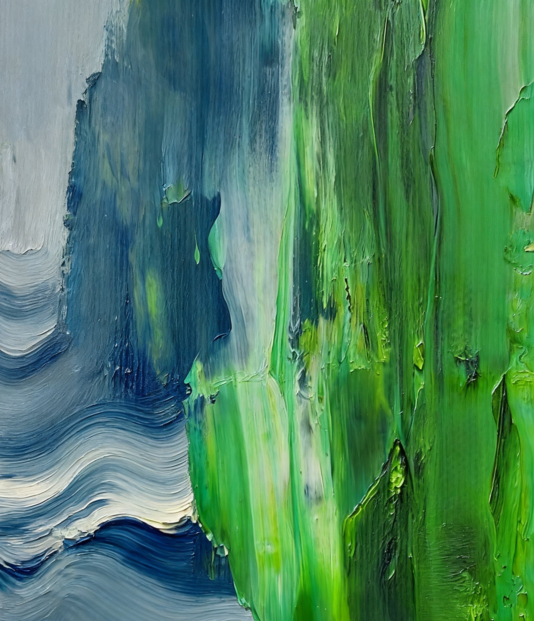 This abstract painting features a striking contrast between vivid green and various shades of blue. The lush, intense green on the right appears almost like a thriving forest or cascading foliage, with thick, textured brushstrokes that give it a sense of depth and vitality. On the left, the blues and grays swirl in fluid, wave-like patterns, evoking the motion of water or mist. The interplay between the two color zones creates a dynamic visual dialogue, suggesting a harmonious yet lively encounter between elements of nature, such as land and sea or forest and sky. The textured application of paint adds a tactile quality, inviting viewers to not only see but also almost feel the energy and movement within the composition.
