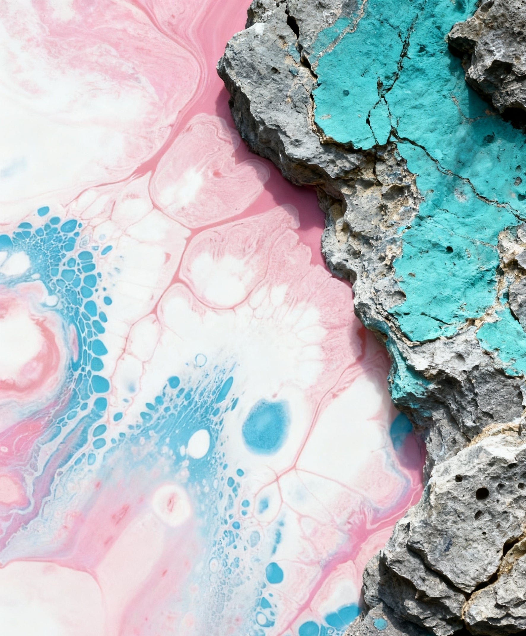 This image presents a captivating juxtaposition of rugged rock and fluid, colorful patterns. On one side, there's a textured rock formation with patches of turquoise, showcasing the rough, natural beauty of stone with its cracks and uneven surfaces. On the other side, a dreamy blend of pink, white, and blue hues flows in organic, marbled patterns, reminiscent of swirling liquid or abstract natural phenomena. The contrast between the hard, solid rock and the soft, fluid colors creates a visually striking and harmonious composition, inviting viewers to appreciate the interplay between nature's raw textures and its more ethereal, colorful expressions.